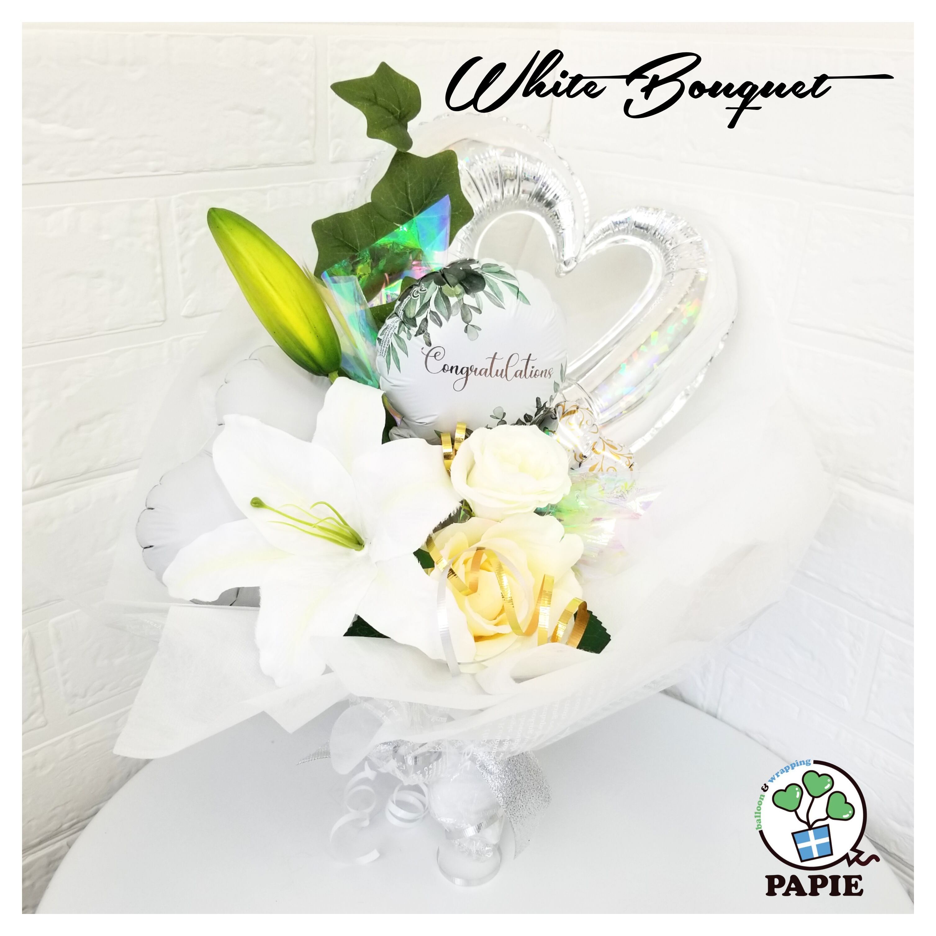 ホワイトとグリーンの2カラーのみで統一したバルーンブーケです!